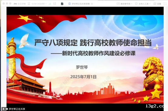 2025年7月1日, 在庆祝中国共产党成立104周年之际,中文党支部举行主题党日活动,人文学院副院长罗世琴以“严守八项规定,践行高校教师使命担当”为主题,为中文党支部教师讲授了一堂新时代高校教师作风建设的专题党课,本次党课深刻阐释了高校教师强化作风建设重要意义和时代价值,而且结合高校教育的特殊性指明了践行优良作风的方法路径。中文支部全体教师参与了本次活动。